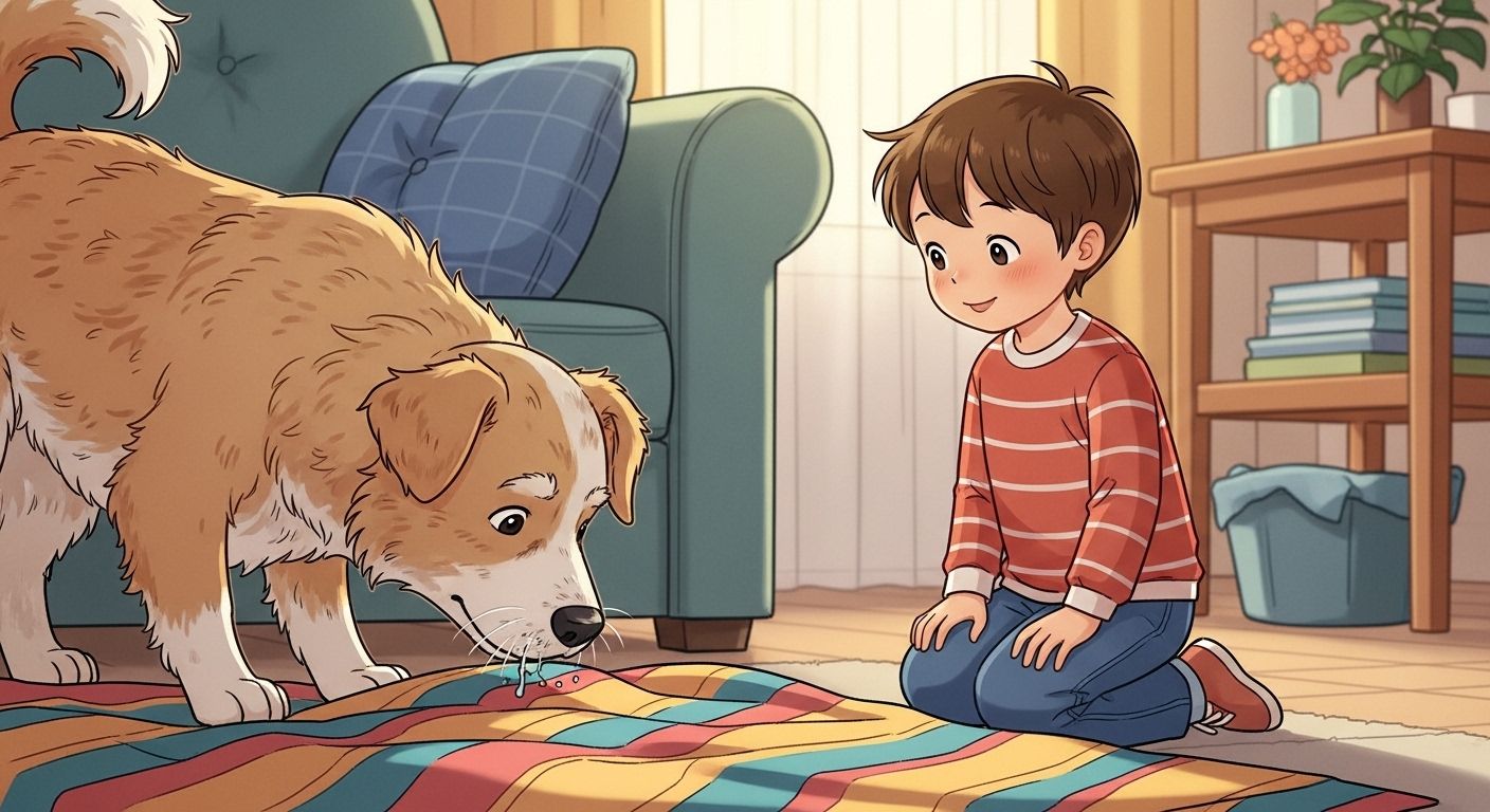 Ein Kind beobachtet lächelnd seinen Hund, der aufmerksam an einer Kuscheldecke schnüffelt.