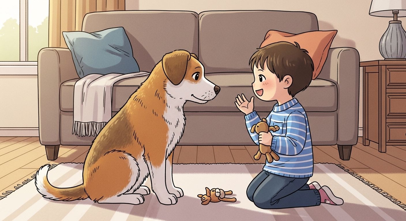 Ein fröhliches Kind spricht mit seinem Hund, der aufmerksam den Kopf schieflegt.