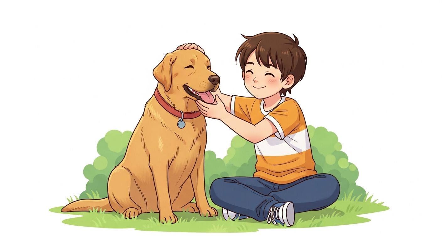 Ein fröhliches Kind streichelt einen goldenen Labrador Retriever in einem sonnigen Park.