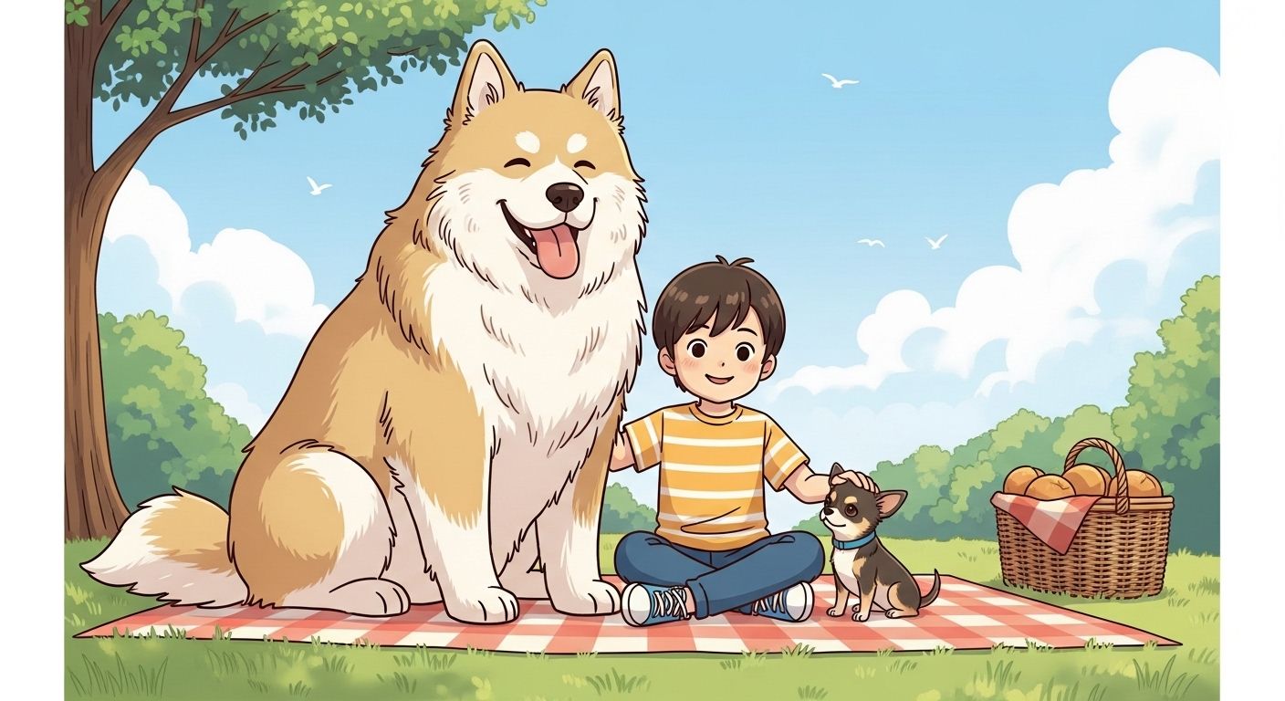 Ein Kind sitzt im Park auf einer Decke und streichelt einen riesigen, wuscheligen Hund und einen winzigen Chihuahua.