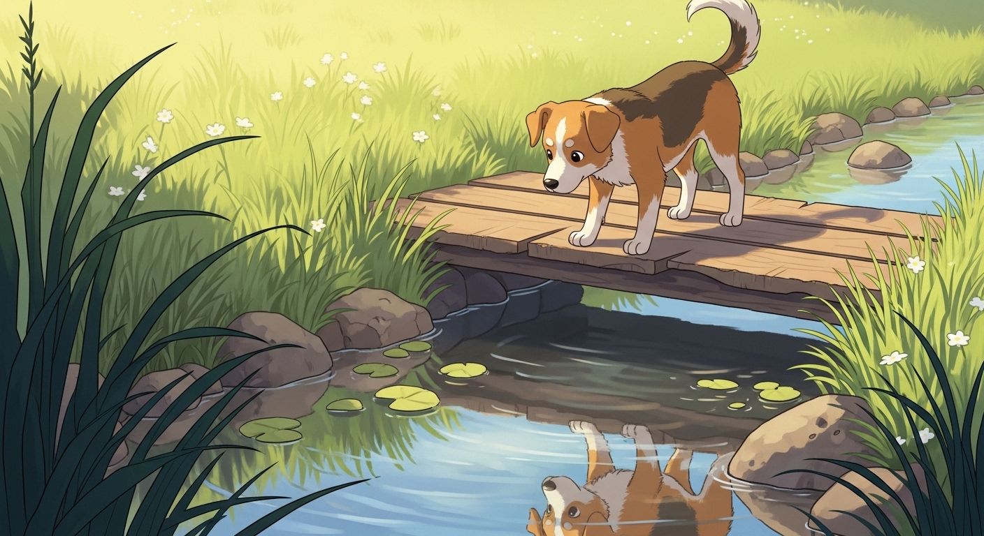 An einem Sommertag trägt ein Hund stolz ein saftiges Stück Fleisch im Maul. Als er eine kleine Holzbrücke überquert, blickt er in das klare Wasser. Dort sieht er einen anderen Hund mit einem scheinbar noch größeren Stück Fleisch. Er erkennt nicht, dass es nur sein eigenes Spiegelbild ist. Der Hund wird gierig und will auch diesen Schatz haben. Doch als er das Maul zum Bellen öffnet, fällt sein echtes Fleisch ins Wasser und versinkt. Am Ende steht der Hund hungrig da, weil er den Unterschied zwischen Schein und Sein nicht erkannt hat.